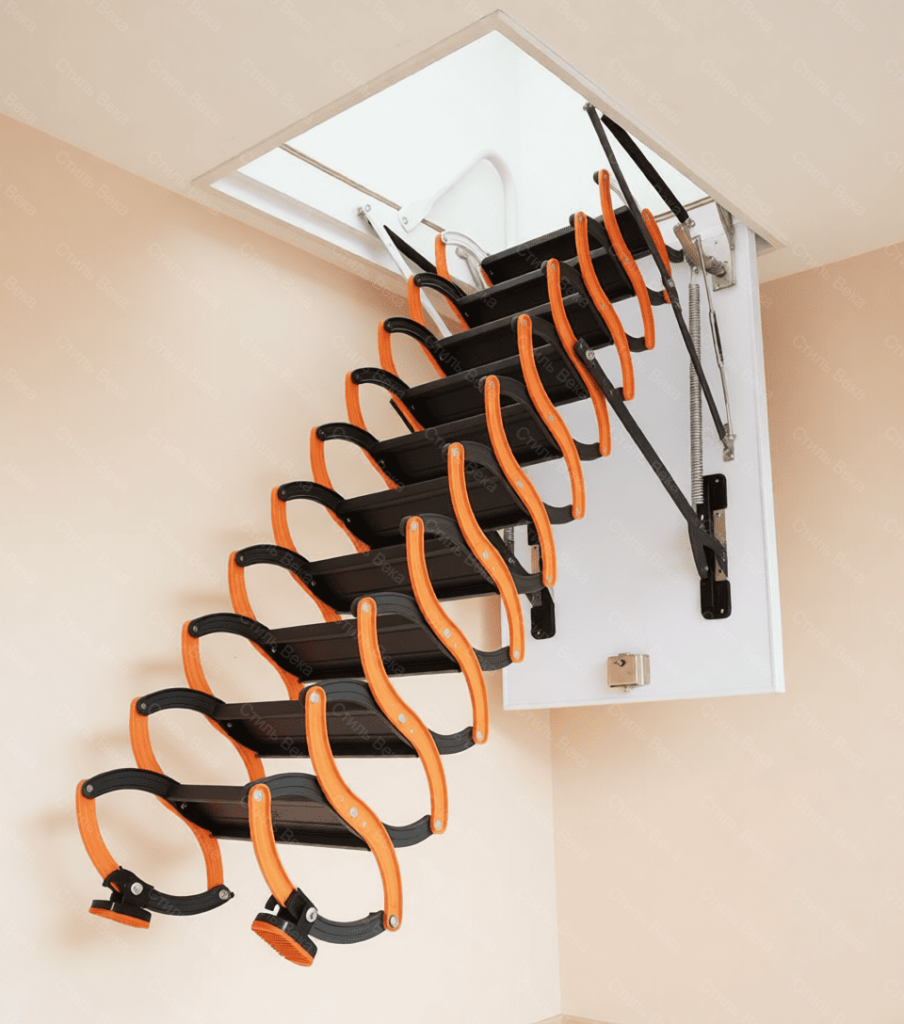 Идеальный вариант для экономии места — складная лестница-ножницы (ещё называют «гармошкой») или телескопическая. Они крепятся прямо в проём чердачного люка и убираются целиком наверх. В сложенном виде её вообще не видно, место не занимает вообще. Можно и стационарную сделать, например, винтовую — но это сложнее и дороже.