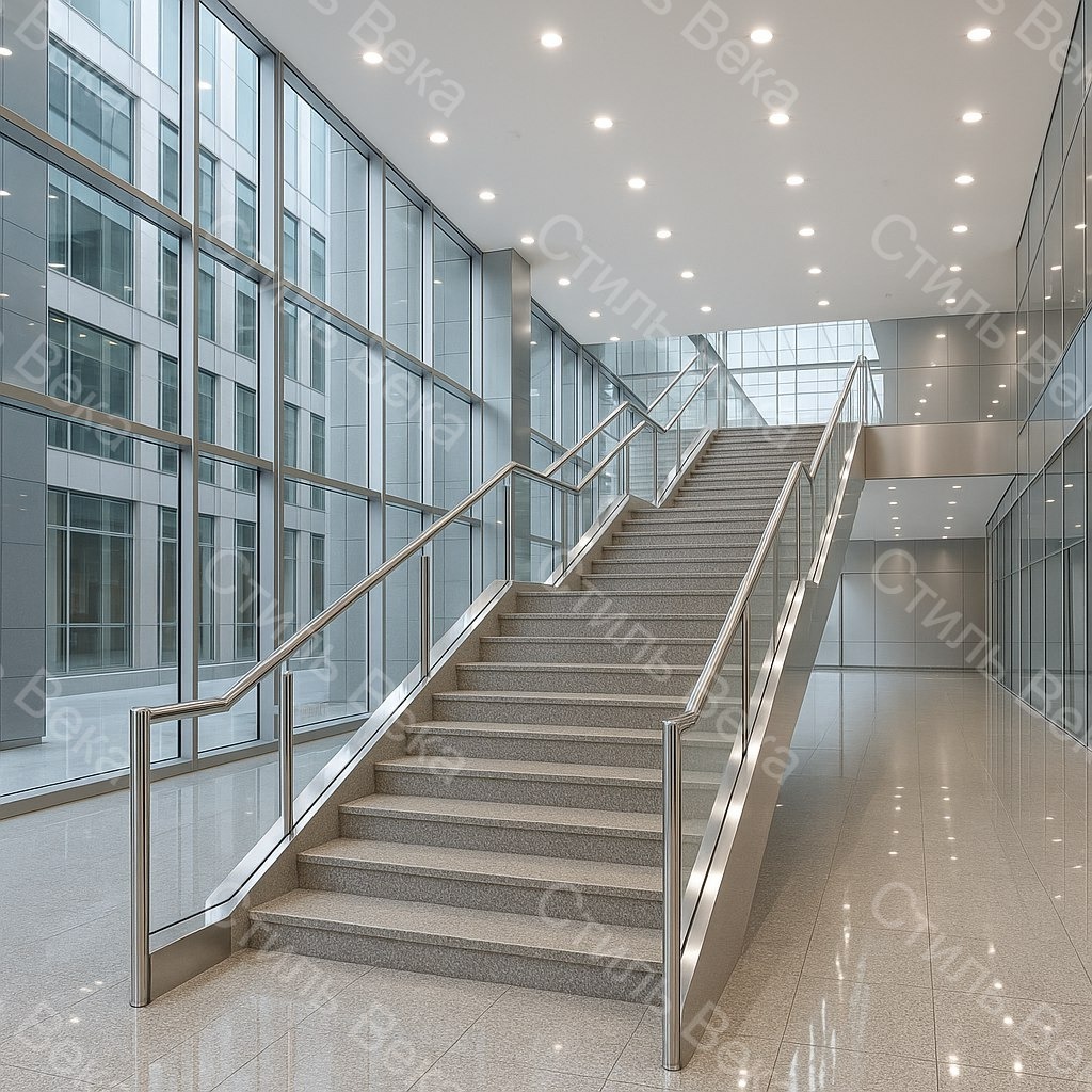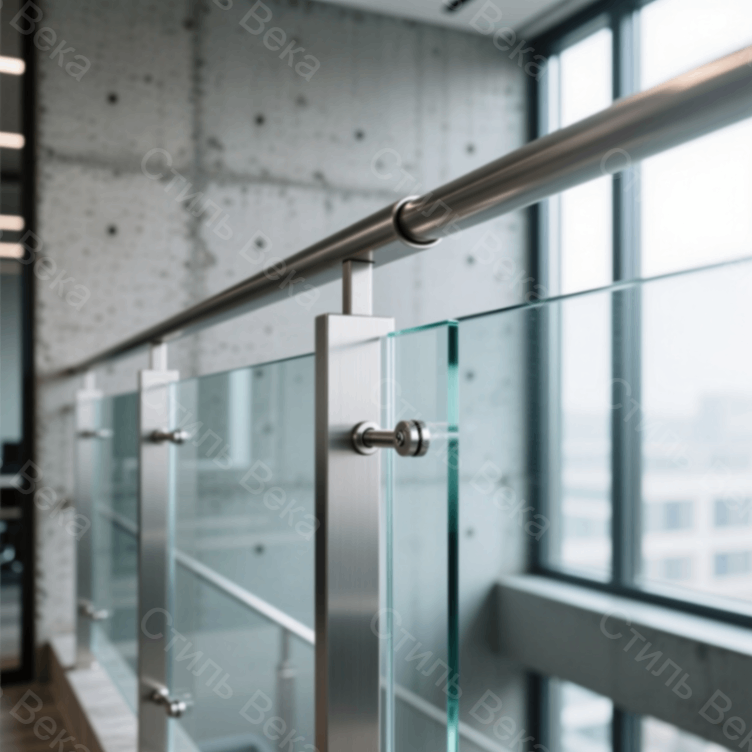 Компания «Стиль Века» производит элегантные перила со стеклом и одним поручнем из нержавеющей стали.